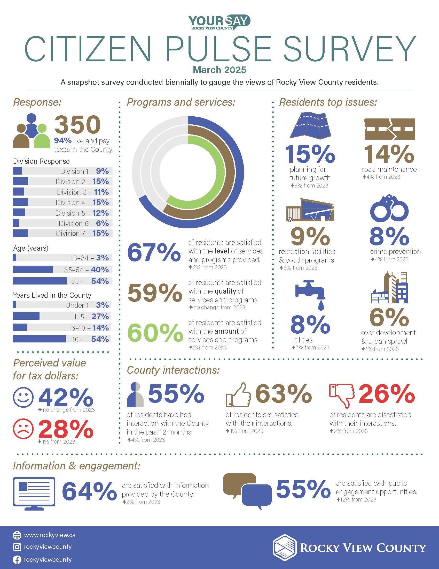 For the past four years Rocky View County has worked with a third-party research firm, to find out resident satisfaction levels. On odd years we do a smaller "Pulse" phone survey and on even years we do a full participatory Citizen Satisfaction Survey online and through phone. Here are the highlights and results of all our surveys. Thank you for participating and engaging with us as we can use this information to make operational improvements and support Council in priority setting.